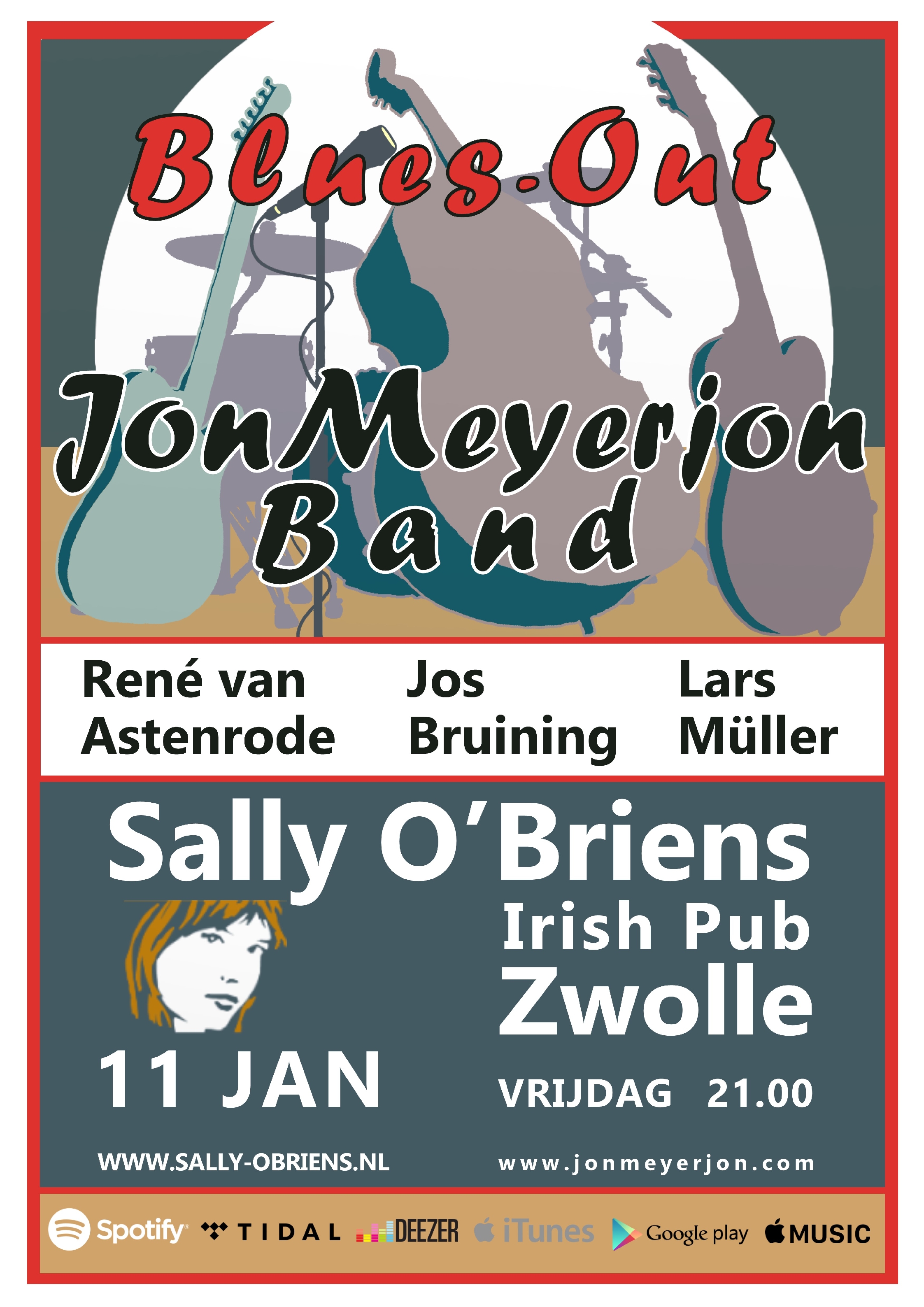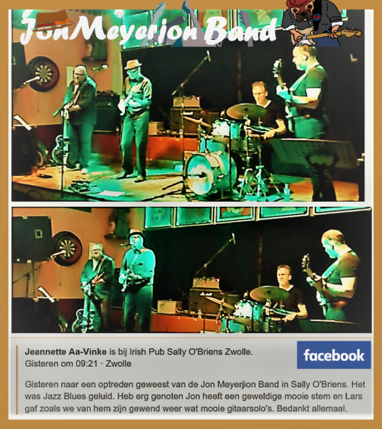 De ‘Jon Meyerjon Band’ moet je toch echt een keer live gezien hebben. Deze band bestaat uit Jon Meyerjon (Johan Meijer) als zanger en gitarist, Lars Müller (gitaar en achtergrondzang), René van Astenrode (drums) en Jos Bruining (bas). Het concert waar ik bij aanwezig was in ‘Sally O’Briens Irish Pub’ op vrijdagavond 11 januari noemen ze zelf een ‘Blues-Out’.